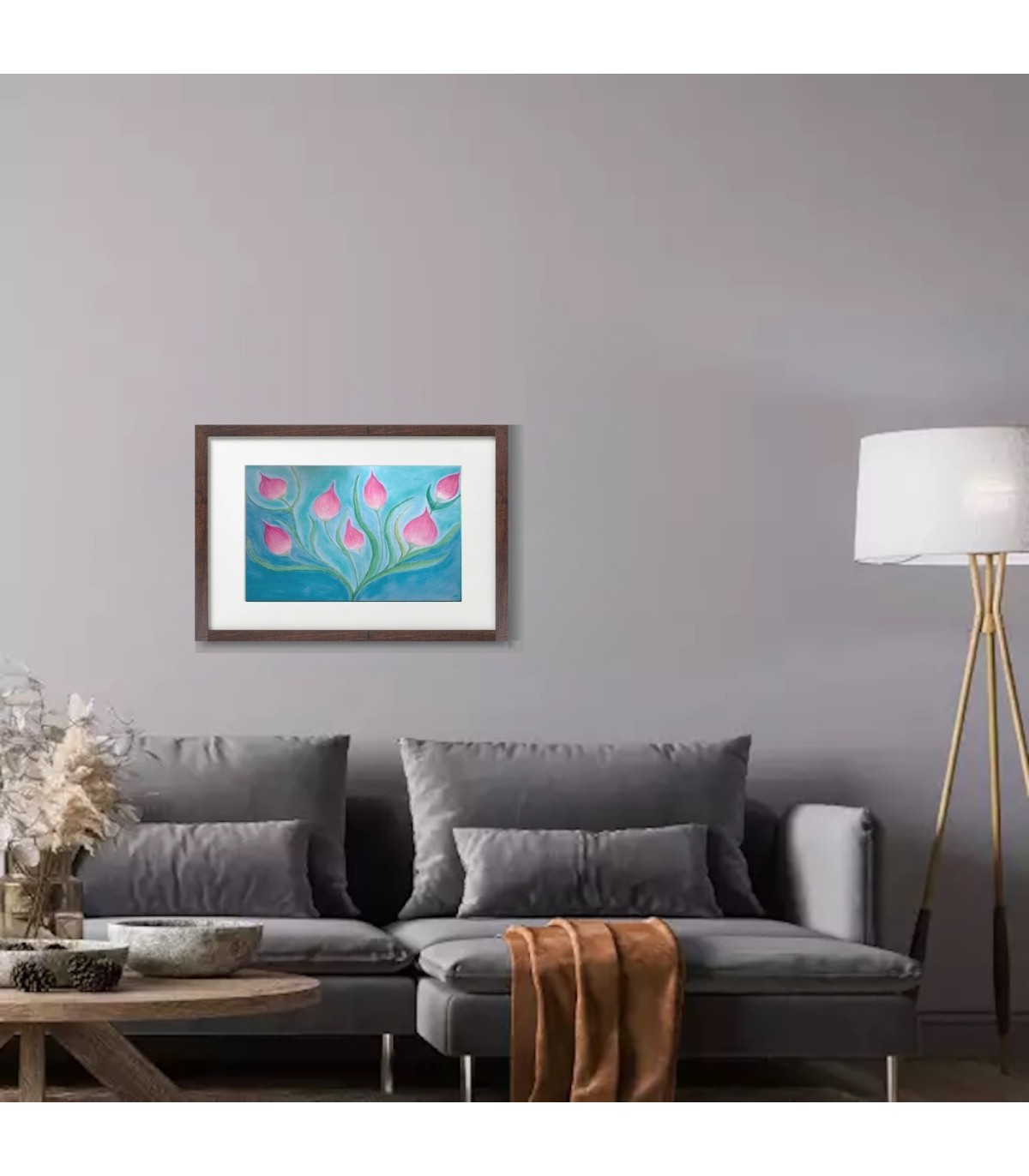 Tableau réalisé au pastel sec représente un arrangement de boutons de fleurs roses stylisés, dont les formes sont légèrement abstraites. Les fleurs, sont allongées et pointues, suggérant des boutons floraux en pleine croissance. Elles sont entourées de tiges et de feuilles vertes fluides qui s'étirèrent vers le haut.