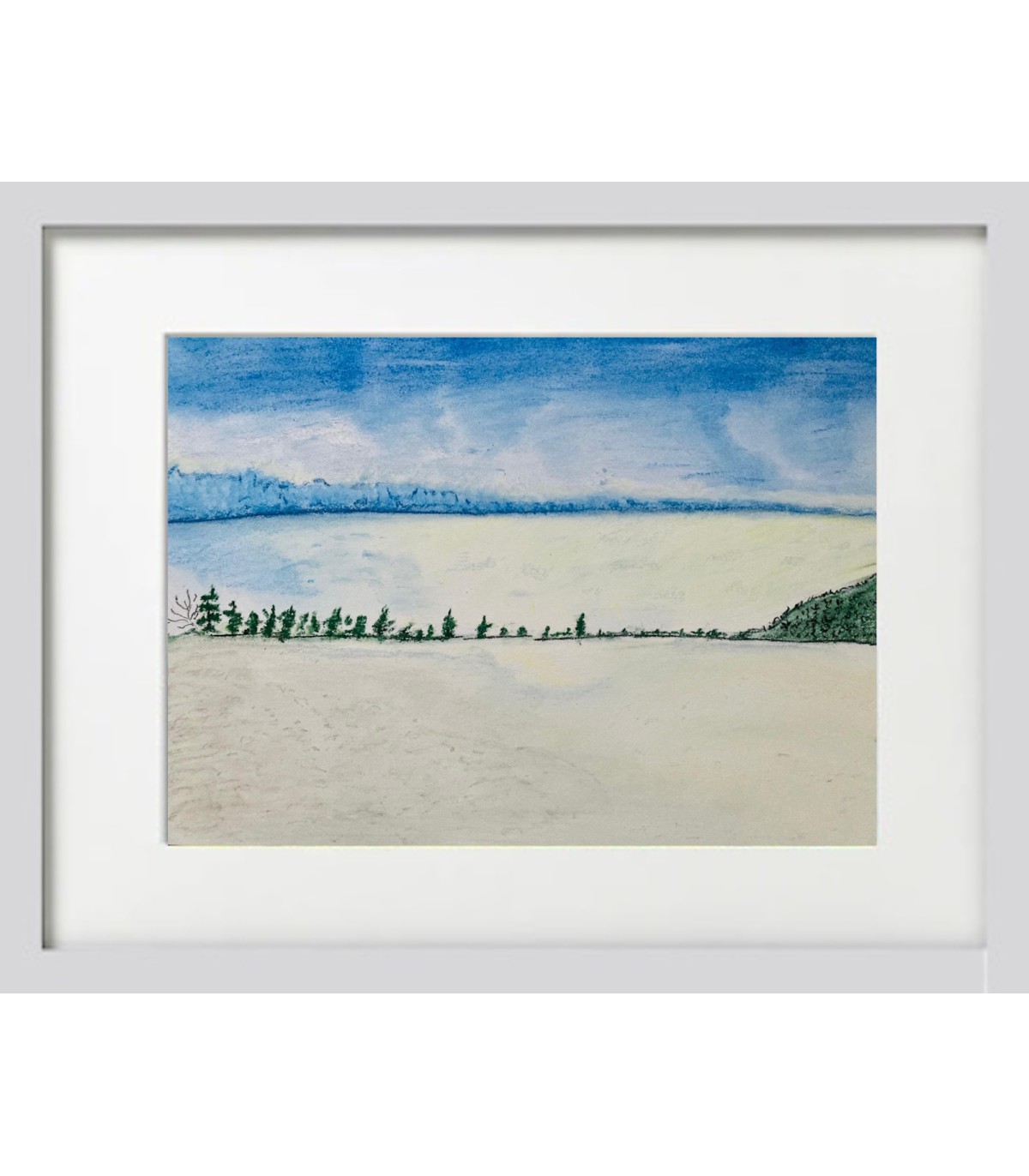 Ce tableau représente un paysage d'hiver minimaliste, dominé par des tons froids et calmes. Un vaste ciel bleu, parcouru de nuances subtiles, surplombe une étendue enneigée immaculée. Une fine rangée d'arbres verts, délicatement dessinée, marque la séparation entre la terre et le ciel. Sur la droite, une colline boisée ajoute une touche de profondeur à la scène. L'ensemble évoque la tranquillité et l'immensité d'un paysage hivernal serein.