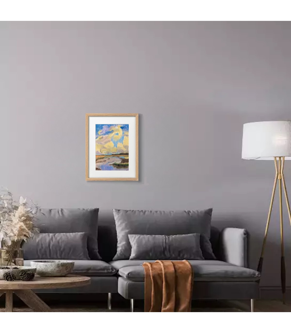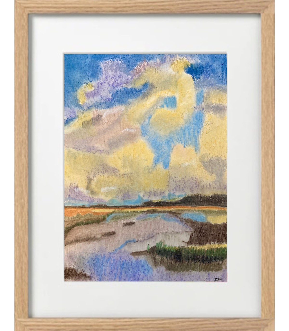 Ce tableau explore une scène de nature baignée de lumière changeante. Le ciel, vibrant de nuances dorées, bleues et violettes, semble animé par des formes éthérées qui évoquent des figures célestes ou des nuages en mouvement. En dessous, une plaine marécageuse s'étend, avec des reflets d'eau capturant les couleurs du ciel. Les touches de vert et d'ocre sur le sol suggèrent une transition entre la terre et l'eau, renforçant le sentiment de fluidité. L'œuvre invite à contempler la connexion entre le ciel et la terre, dans une atmosphère à la fois mystique et apaisante.